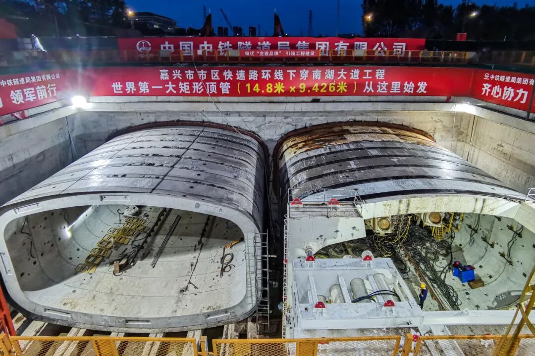 中铁装备针对项目进行了定制化设计,“南湖号” 宽14.82米、高9.446米,整机采用 “6前8后” 多刀盘组合开挖设计、盾体分块优化设计、多螺机出渣设计、自动减摩及信息化检测等技术,解决了超大断面矩形顶管机施工一次开挖成型、主机姿态控形及土体沉降控制等技术难题,具有不影响交通、不破坏环境、安全高效等特点,并开创了矩形顶管机首次成功应用于单向3车道矩形隧道施工的先河。