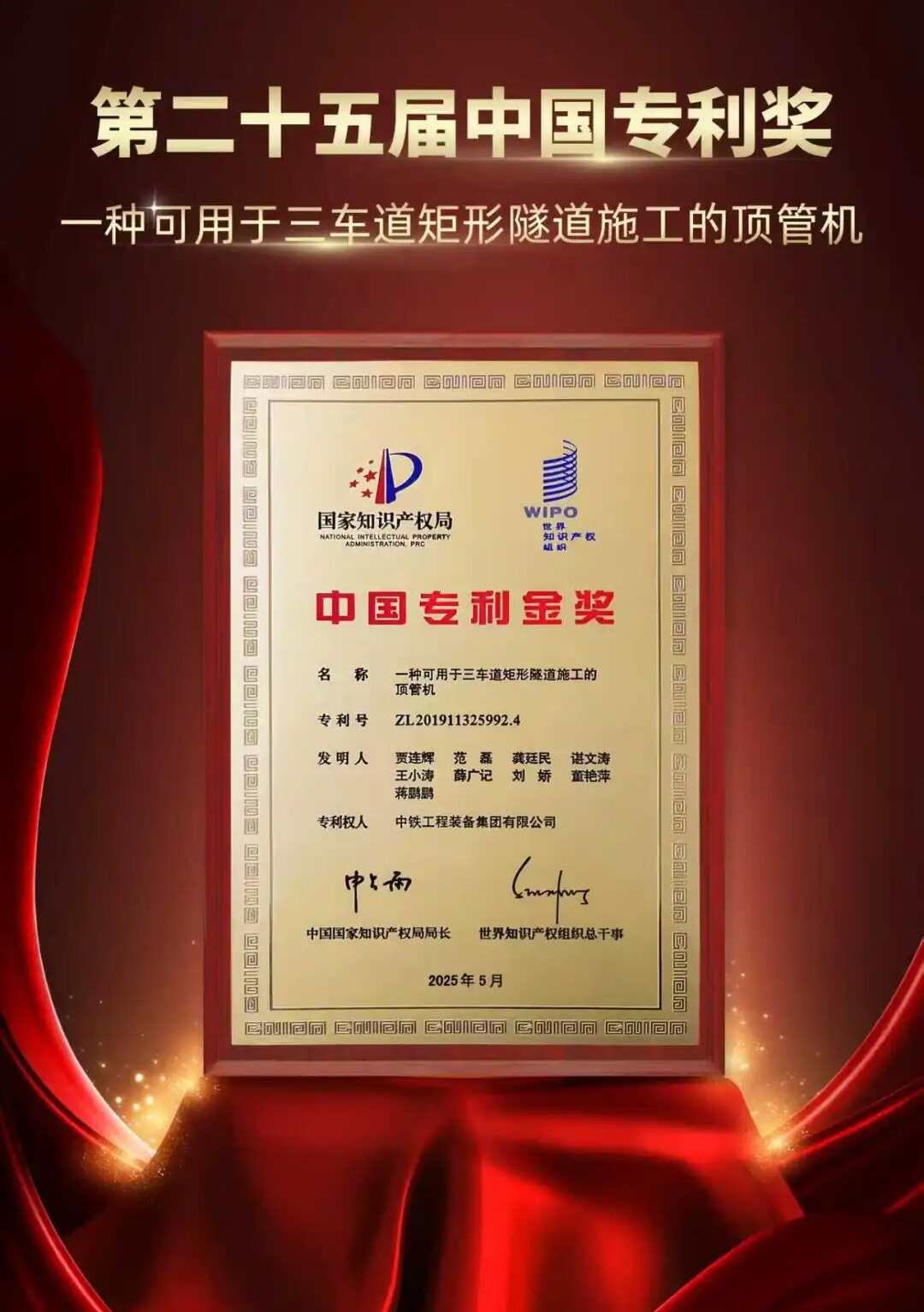 10月13日,在辽宁大连举办的第十四届中国国际专利技术与产品交易会开幕式暨第二十五届中国专利奖颁奖大会上,中国中铁再创佳绩,共荣获1项金奖、1项优秀奖。其中,中铁工业旗下中铁装备的发明专利 “一种可用于三车道矩形隧道施工的顶管机” 荣获中国专利金奖,标志着公司在地下空间开发高端装备领域实现重大突破,为城市隧道建设提供了全新技术方案。此外,中铁四局研发的专利《一种智能铺轨方法及智能铺轨装备》荣获中国专利奖优秀奖。
